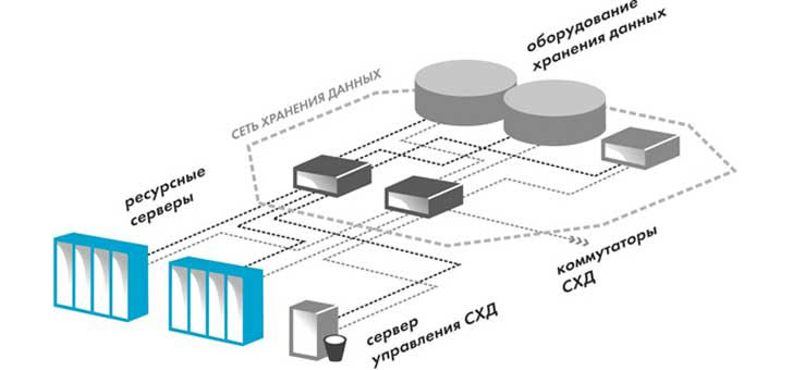Хранилище данных, дисковые массивы — основное оборудование хранения данных, обработка данных, формирование логической структуры ее хранения (дисковых томов и файловых систем) выполняется на серверном оборудовании.